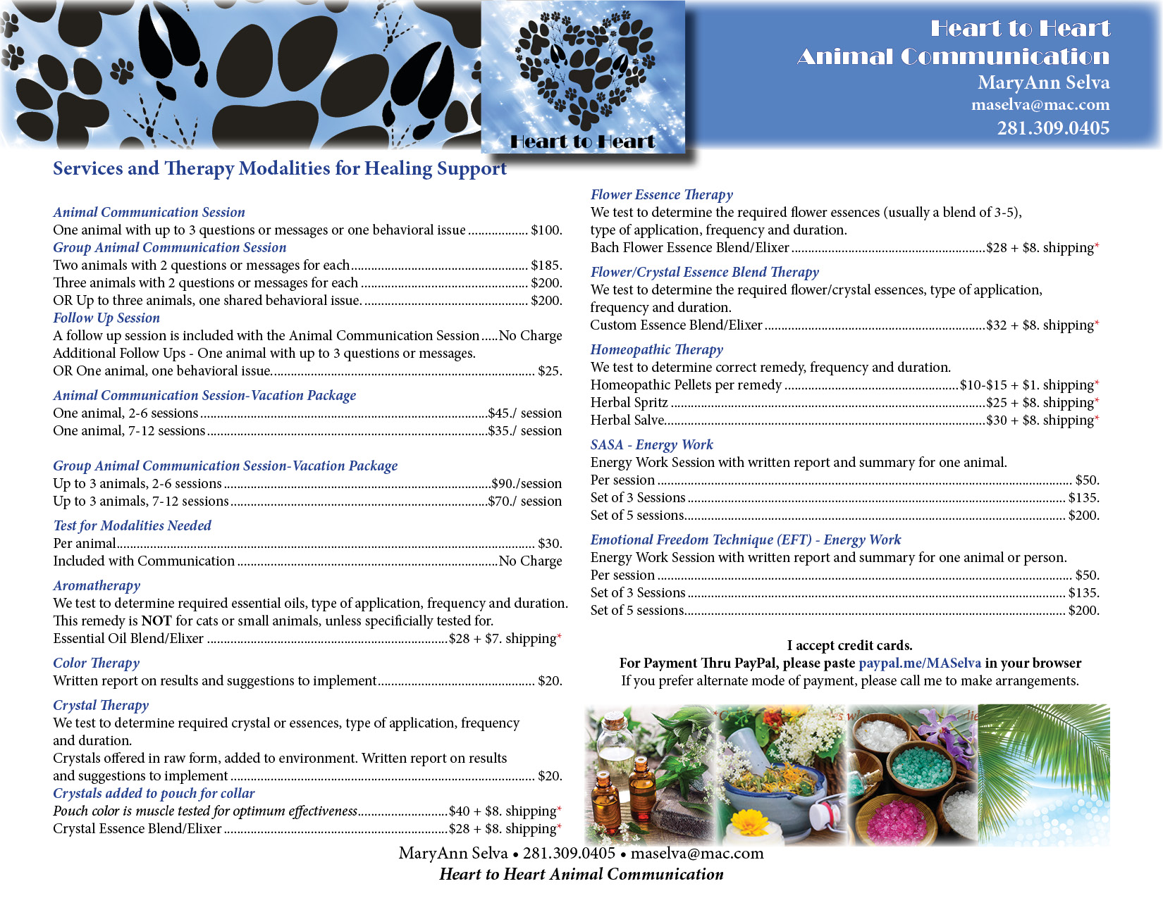 The Animal Communication service is $100 and includes questions you may have after I have connected with your pet. Future follow ups for that pet are $25. per session.